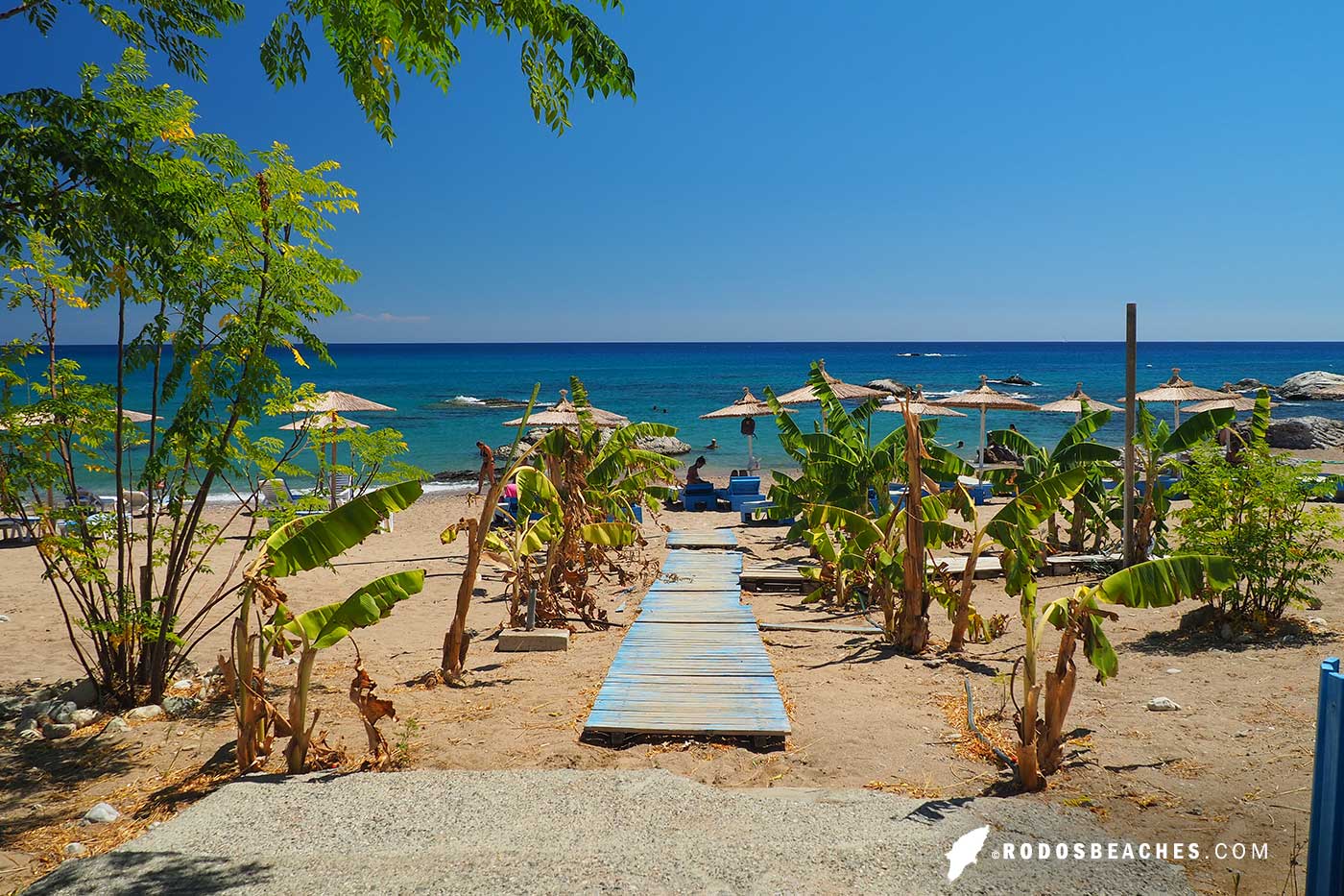 There are several well maintained areas with banana palms and lush vegetation, which usually belong to Stegna’s bars. You can lie down here under parasols, and of course guests can order cold drinks and other refreshments.